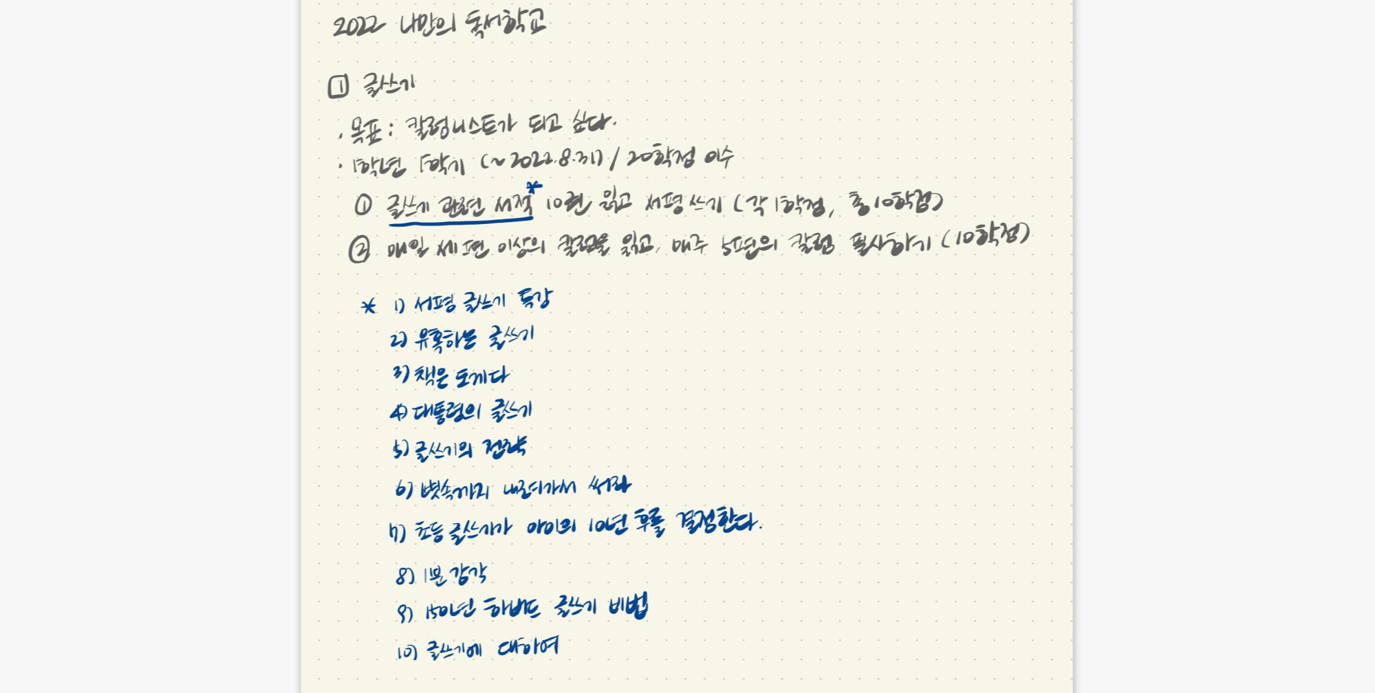나만의 독서학교의 특징은 전공 선택이 자유로우며, 이수하지 못하더라도 과정 중에 '스스로 학습법'을 배울 수 있고, 관심분야가 자연스럽게 확장되며, 무엇보다 학비가 저렴하다는 것입니다. 제가 배우고 싶은 것이 많아 '뭐든지 책으로 배우기' 블로그를 만든 것과 통하는 부분이 있지만 책을 통한 저의 공부방식은 체계성이 많이 부족했습니다. 그래서 저자의 조언대로 2022년 내가 공부하고 싶은 과목을 '글쓰기'와 '드로잉'으로 압축시키고 나만의 커리큘럼을 짜 보았습니다. 그중 '글쓰기' 커리큘럼은 아래와 같습니다.