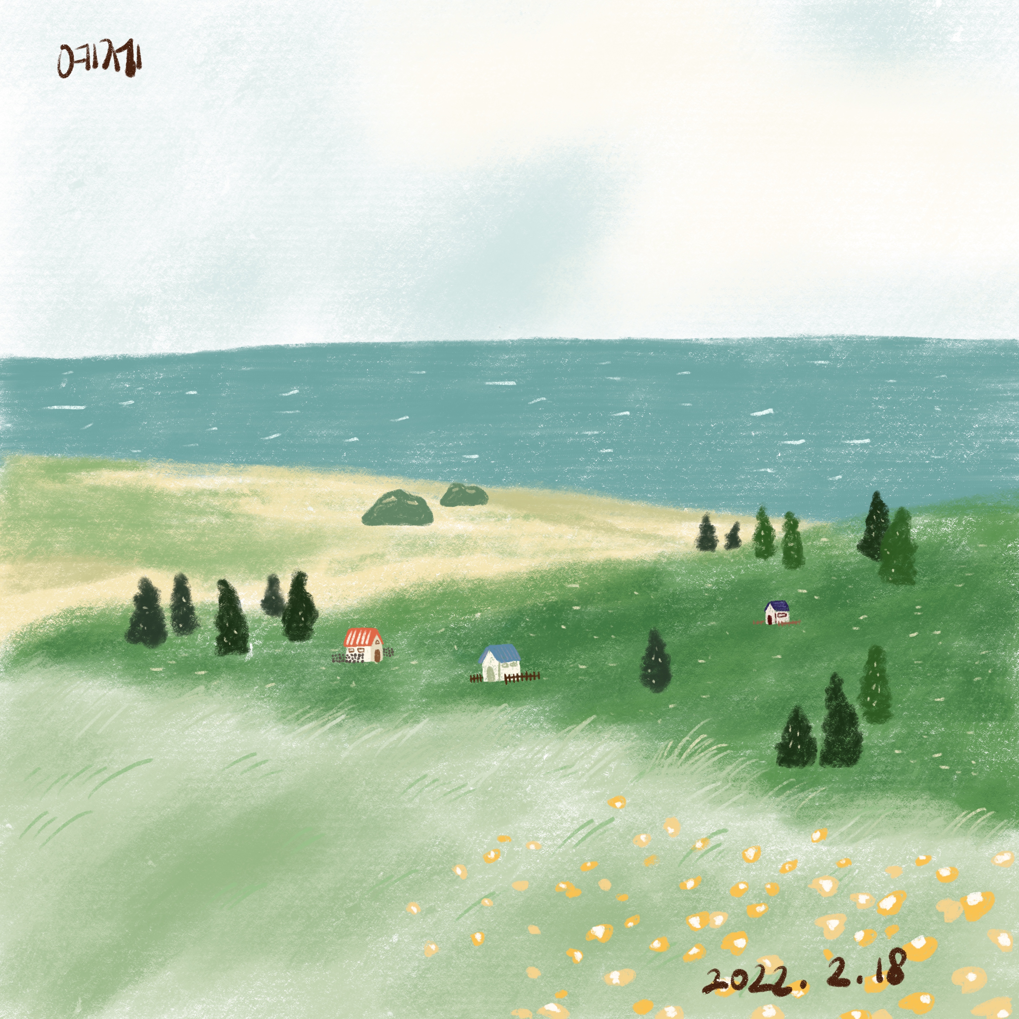 아... 정말 그리운 그 시절, 그래도 여행을 자유롭게 떠날 수 있었던 그 시절이 언젠가는 우리의 품으로 돌아오겠지요? 더디지만 꼭 돌아올 거라 믿습니다. 제주도 풍경을 따라 그려보며 지난 여행의 추억에 푹 잠겼던 시간이었습니다. 여행지에서의 추억을 여행을 다녀온 후 그림으로 남긴다면 더 의미 있겠구나, 기억에 오래오래 남겠구나 생각이 듭니다. 지겨운 코로나가 끝이 나고 가족여행을 떠나 틈틈이 아이패드로 여행의 기억을 그림으로 남기는 제 모습을 상상해봅니다.