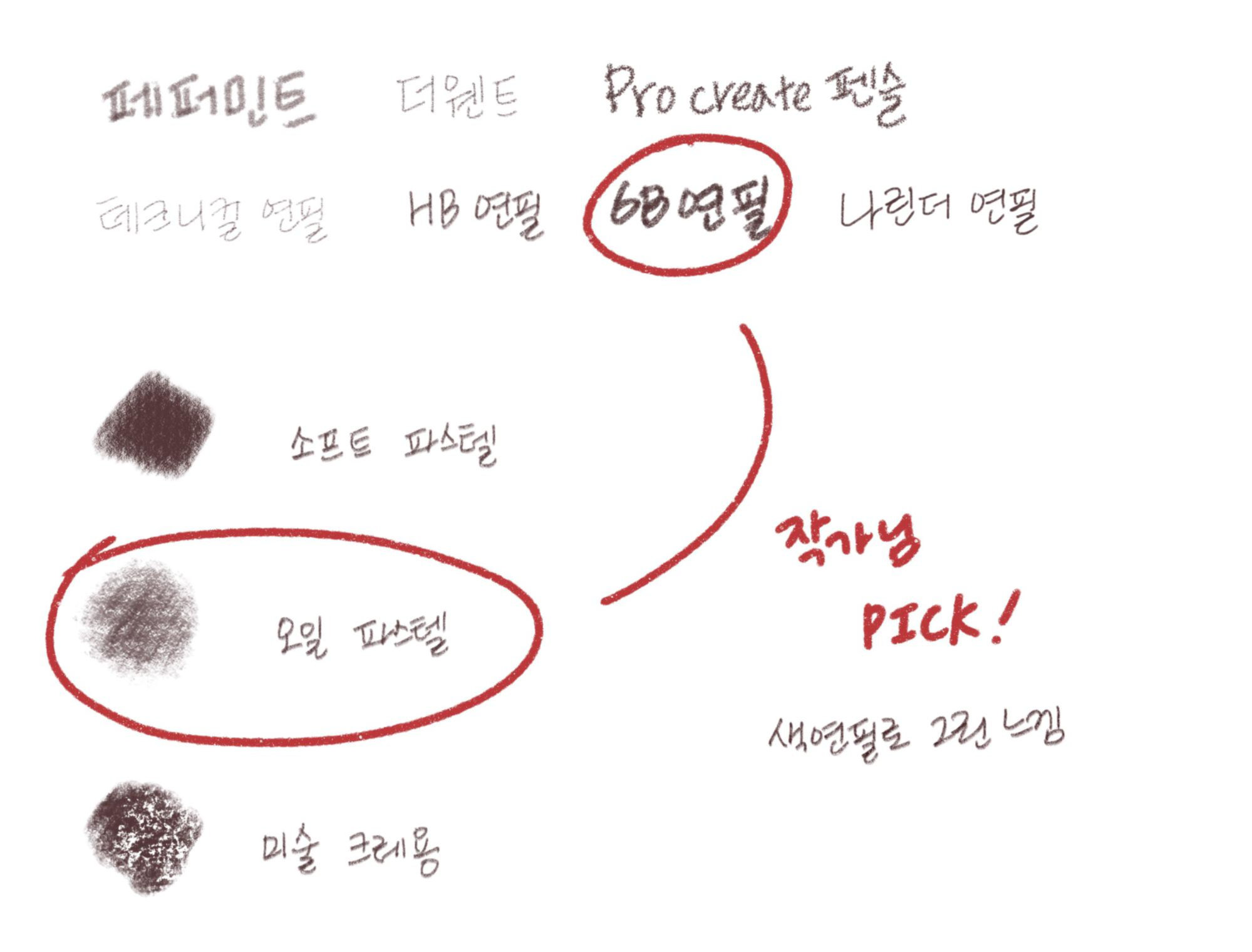 어제 오늘 작가님이 그림 그릴 때, 채색할 때 쓴 브러쉬는 6B연필 브러쉬와 오일 파스텔 브러쉬입니다.. 색연필화의 느낌이 나서 저도 자주 쓰게 될 것 같은 브러쉬들입니다. 다른 스케치 브러쉬들도 궁금해져서 하나하나 써봤습니다. 전 작가님이 쓰시는 브러쉬도 물론 좋았고 페퍼민트랑 소프트 파스텔 브러쉬도 마음에 들었습니다.